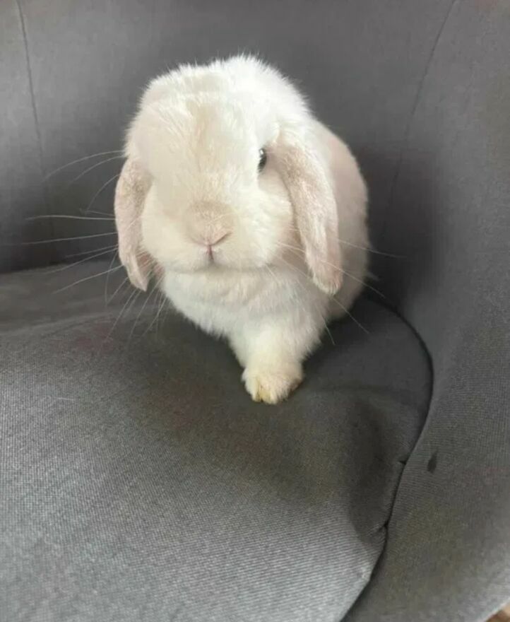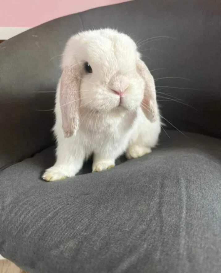 Króliczek jest spokojny, przyzwyczajony do towarzystwa innych zwierząt jak i do ludzi. Zadbany, obcięte pazurki (jedynie uszka pobrudził :D ale w rzeczywistości są całe białe, żadnego szarego koloru)