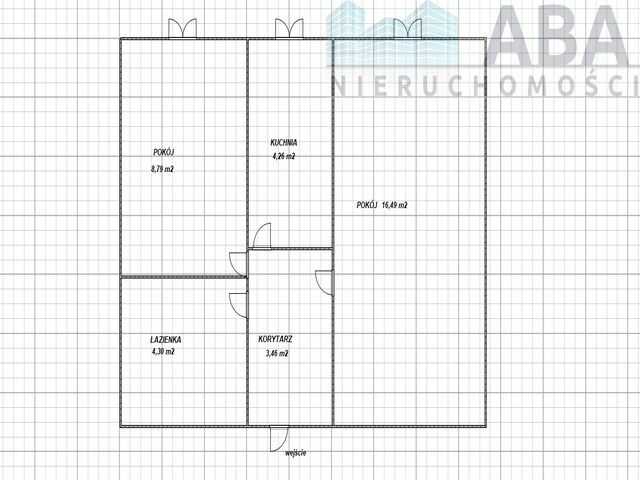 Pomieszczenia - Mieszkanie składa się z: kuchni (4,26 m2), 2 pokoi (8,79 m2, 16,49 m2), łazienki (4,30 m2) i przedpokoju (3,46 m2).